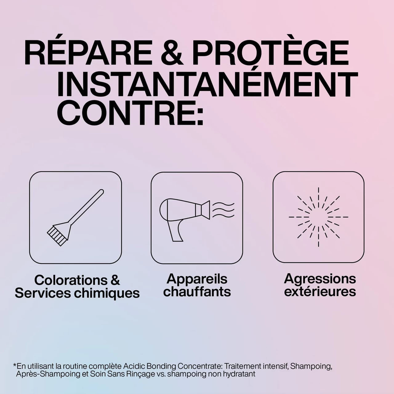 Répare et protège instantanément contre les colorations et services chimiques, les appareils chauffants et les agressions extérieures (pollution, UV…).